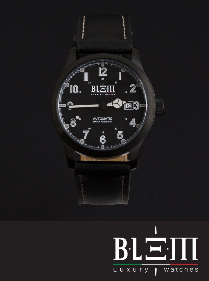 Orologio Swiss Made Automatico per uomo, linea Blem Luxury Watches, modello Brigata Autom M8219 PVD. Orologio con cassa in acciaio inossidabile, finitura PVD nera satinata. Vetro minerale. Cinturino in vera pelle, con fibbia in acciaio inossidabile.