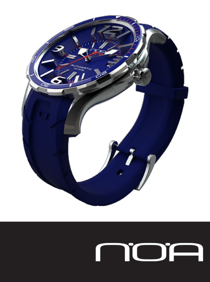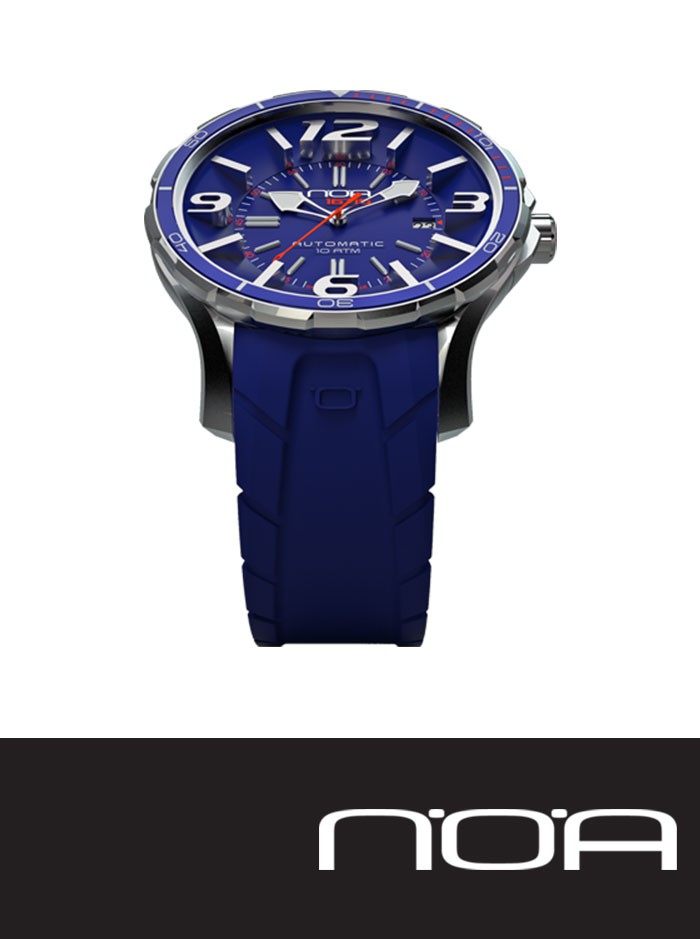 Orologio Swiss Made Meccanico a Carica Automatica, linea N.O.A. 16.75 GA EVO, modello GA EVO-002. Orologio colore blu/argento, con cassa in acciaio inossidabile, costruzione in due parti. Anello superiore girevole in acciaio inossidabile, con lunetta in ceramica. Vetro zaffiro con trattamento antiriflesso. Cinturino in gomma naturale, Fibbia in acciaio, personalizzata con logo N.O.A.