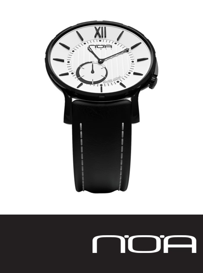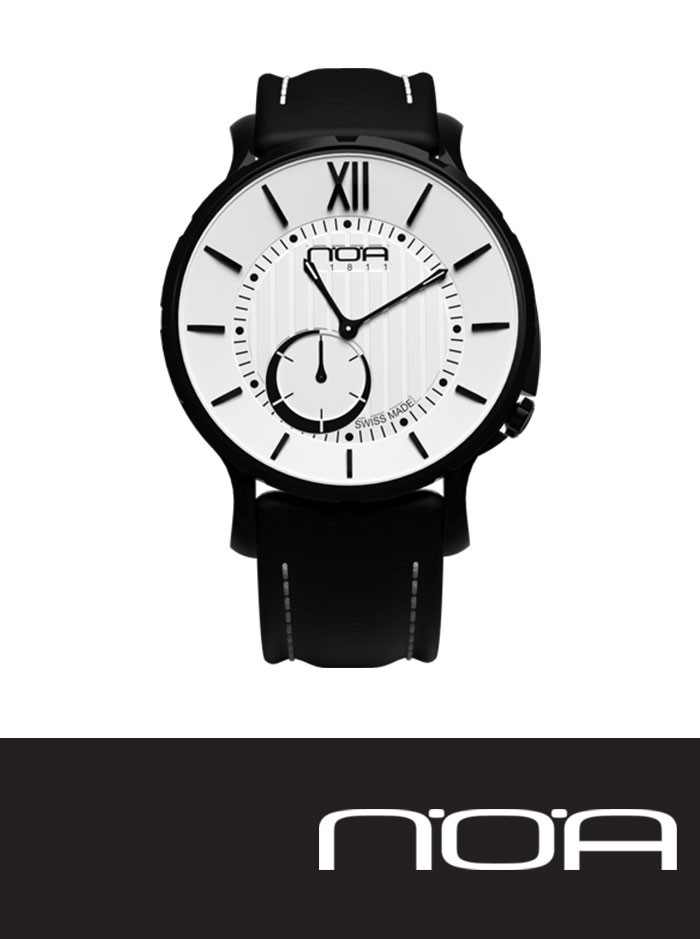 Orologio Swiss Made al Quarzo, linea N.O.A. Watches 18.61 M SLQ, modello MSLQ-004. Orologio colore nero, con cassa in acciaio inossidabile. Anello interno con numeri romani in rilievo. Vetro zaffiro anti-graffio, con rivestimento antiriflesso. Cinturino in pelle colore nero, Fibbia in acciaio inossidabile, personalizzata con logo N.O.A.