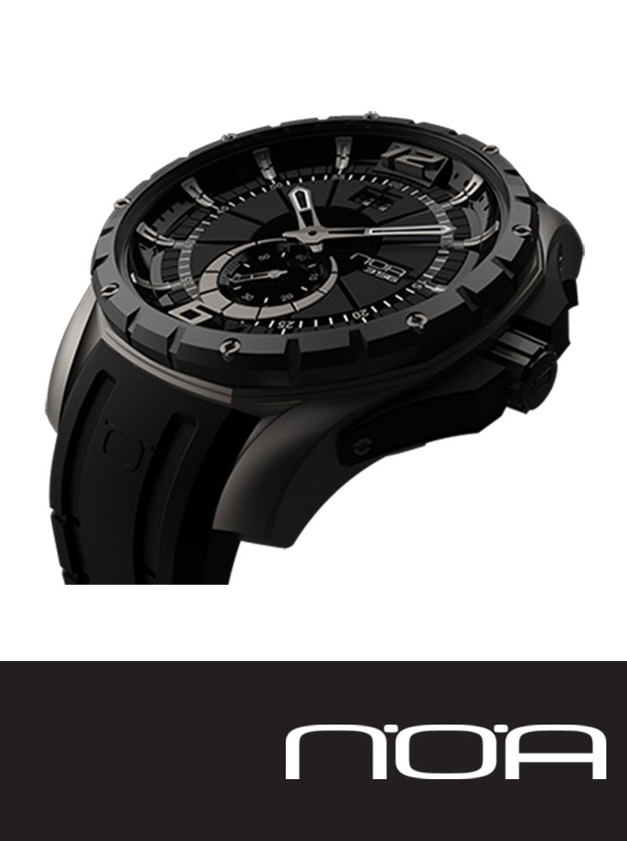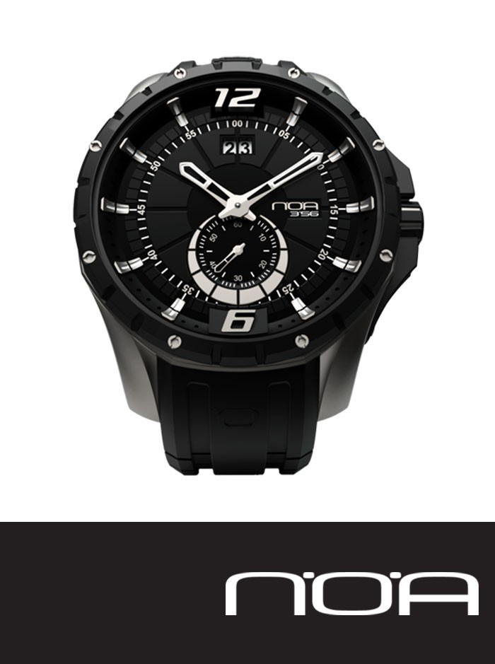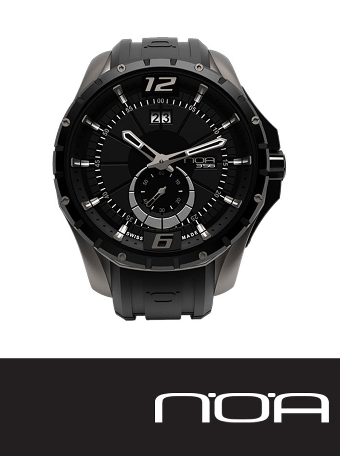 Orologio Swiss Made al Quarzo linea N.O.A. Watches Skandar 3H, modello SK3H-001. Orologio colore nero, con cassa in acciaio inossidabile sabbiata, lunetta placcata in nero e con 8 viti. Vetro zaffiro con trattamento antiriflesso. Cinturino in gomma naturale, Fibbia in acciaio inossidabile personalizzata con logo N.O.A.