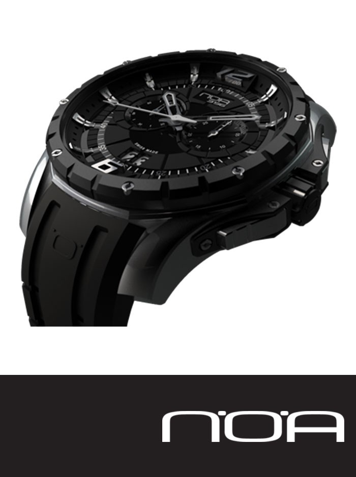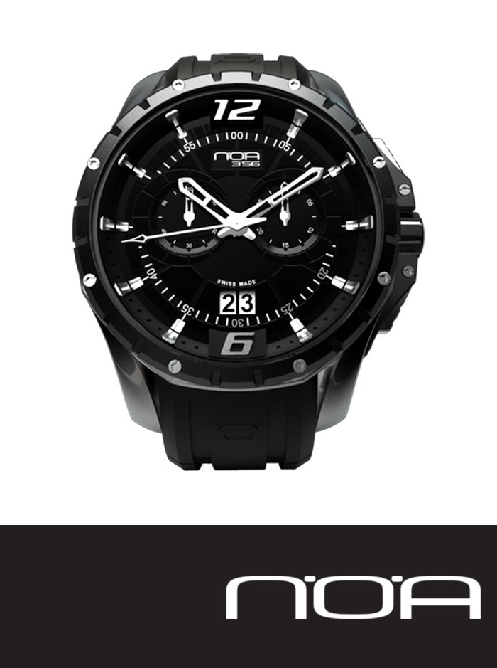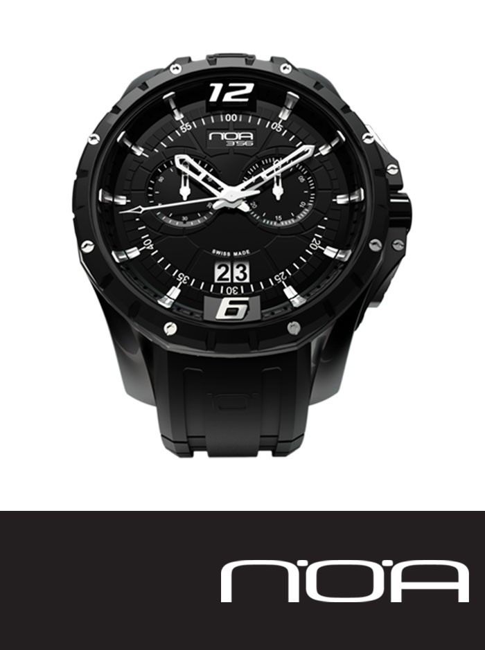 Orologio Swiss Made Cronografo al Quarzo, linea N.O.A. Watches Skandar Chrono, modello SKCH-001. Orologio colore nero, con cassa in acciaio inossidabile. Lunetta in acciaio inossidabile placcata in nero e con 8 viti. Vetro zaffiro con trattamento antiriflesso. Cinturino in gomma naturale, Fibbia in acciaio inossidabile, personalizzata con logo N.O.A.